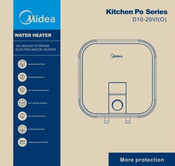 Podgrzewacz wody Midea D10-20VI(O) to 10-litrowy elektryczny bojler akumulacyjny, który idealnie nadaje się do montażu nad zlewem lub umywalką. Prostokątny kształt i nowoczesny design sprawiają, że z łatwością wpasuje się w każde wnętrze.