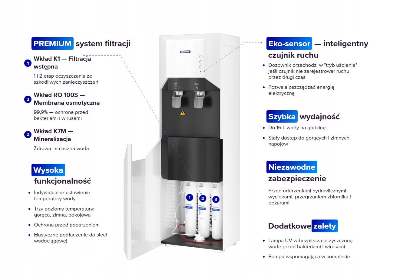 AQUAPHOR RO PRO 100 to profesjonalny dystrybutor wody pitnej z odwróconą osmozą, który łączy najnowocześniejsze rozwiązania filtracyjne z łatwością obsługi i niskim zużyciem energii. Dzięki kompleksowej filtracji, dezynfekcji UV i mineralizacji zapewnia bezpieczną, krystalicznie czystą wodę pitną, idealną do codziennego użytku w biurze, placówce czy hotelu – bez konieczności kupowania wody butelkowane