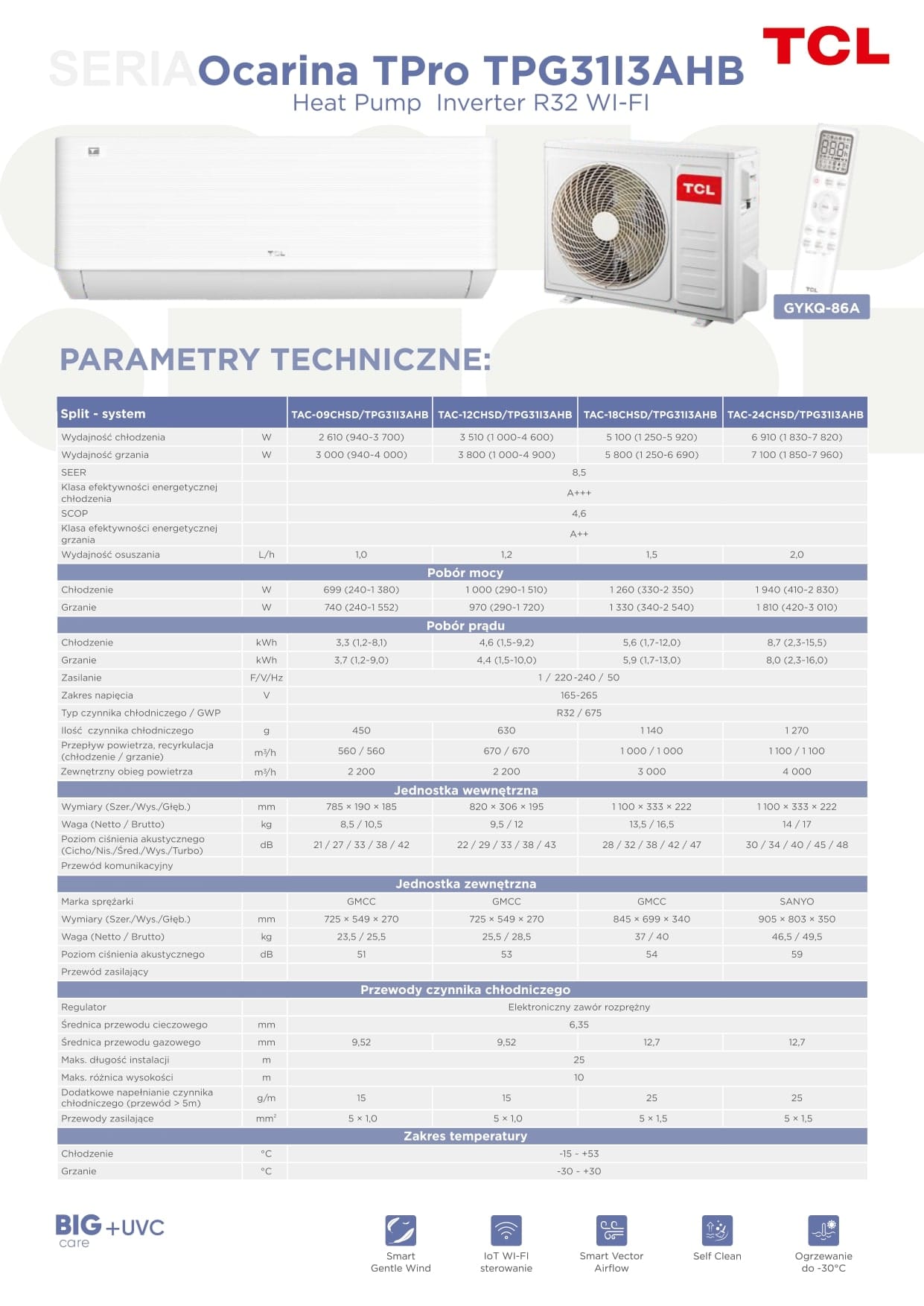 Klimatyzator ścienny TCL Ocarina TPro TAC-09CHSD/TPG31I3AHB 2,6 kW wi-fi, grzanie do -30/jonizacja.