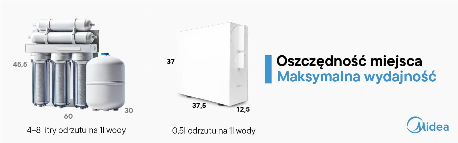 Oszczędność miejsca dopełniona minimalistycznym designem nowoczesnego systemu odwróconej osmozy Midea
