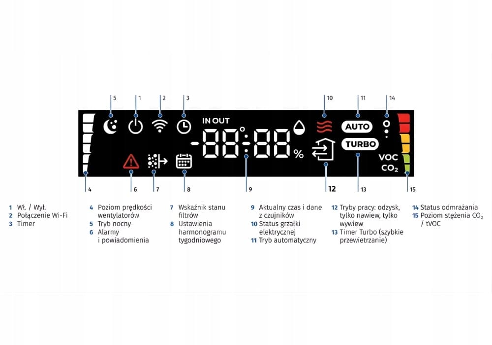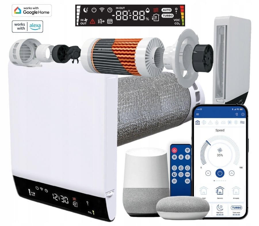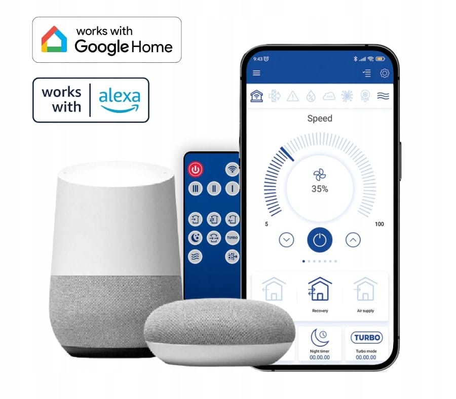 - Zintegrowany moduł Wi-Fi – kontroluj rekuperator z aplikacji w telefonie (Android/iOS) i korzystaj z integracji z Google Asystentem
