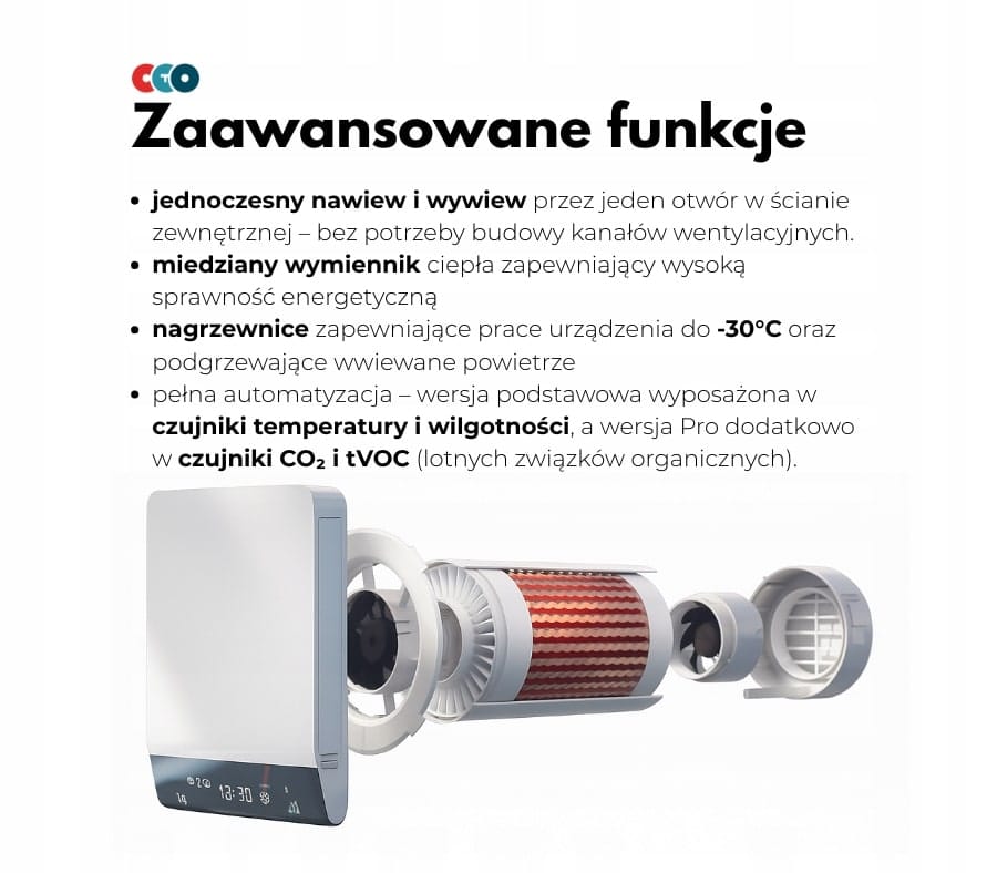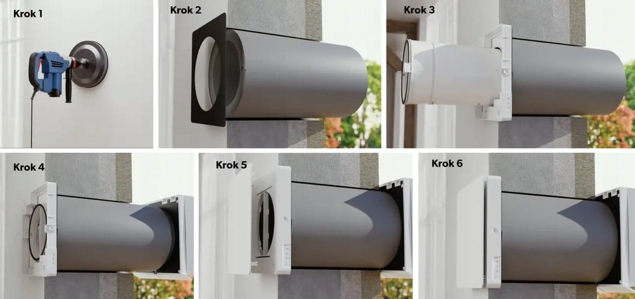 - Instalacja bez trudnych remontów: tylko jeden otwór w ścianie zewnętrznej, bez prowadzenia kanałów wentylacyjnych.